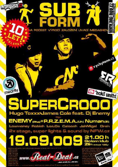 Popis: Září se již po několikáté stává termínem zlínského a uhersko-hradišťského skate a snow shopu SubForm. Tentokrát o něco výjimečnějším, SubForm Zlín slaví již 10. výročí svého založení. Poprvé ve Zlíně vystoupí pražští Supercrooo v sestavě James Cole a Hugo Toxxx za podpory Dje Enemyho: