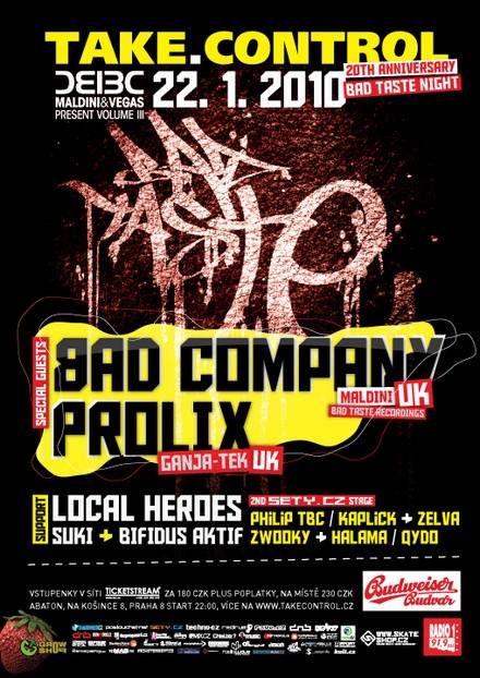 Popis: Drum & bassová party Take Control oslaví svoje 20. vydání. Pozvání na jubilejní díl přijal DJ Maldini, jeden ze členů legendární britské partičky Bad Company. Dále představí i další ze zástupců tohoto vydavatelství, DJ Prolix.
